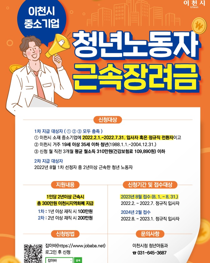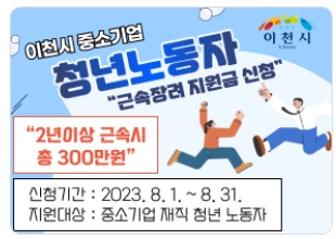 이천시는 2023년 이천시 중소기업 청년노동자 근속장려금 지원사업 참여자를 오는 8월 1일부터 8월 31일까지 모집합니다. 선정되신 분들은 3년간 1인당 총 300만 원의 지원금을 지역화폐로 받습니다. 그래서 오늘은 이천시 중소기업 청년노동자 근속장려금지원사업 신청방법과 신청대상, 지원내용에 대해 알아보겠습니다.