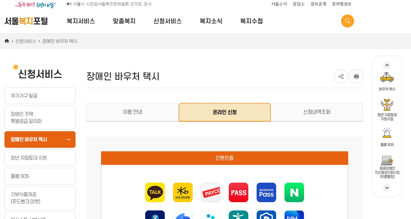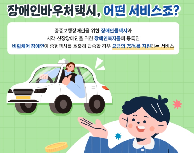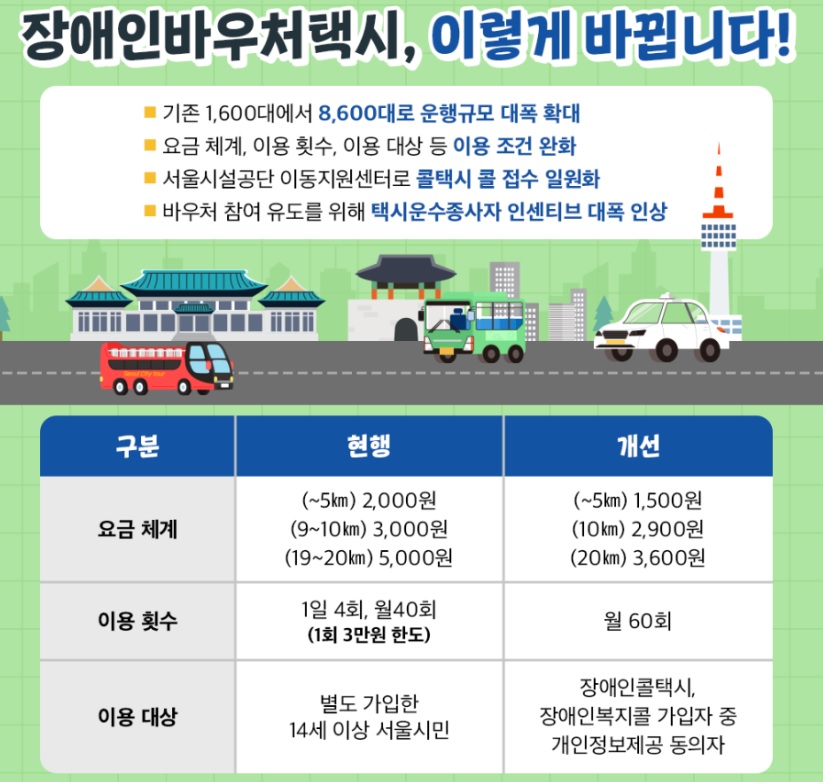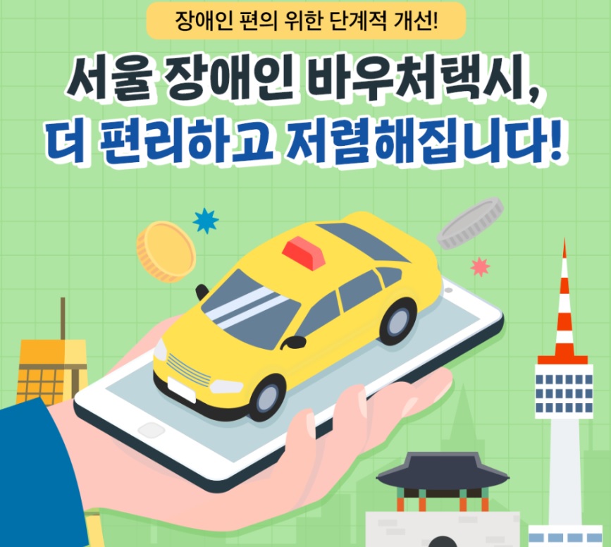 서울시에서 비휠체어 장애인의 주요한 대체교통수단인 장애인 바우처택시 요금을 지원합니다. 택시가 아니면 이동하기 어려운 장애인의 편의를 보장해 주는 사업입니다. 1회 지원금액 30,000원이며 월 40회 이용가능합니다. 아래에서 지원자격 및 신청방법을 알아보겠습니다.
