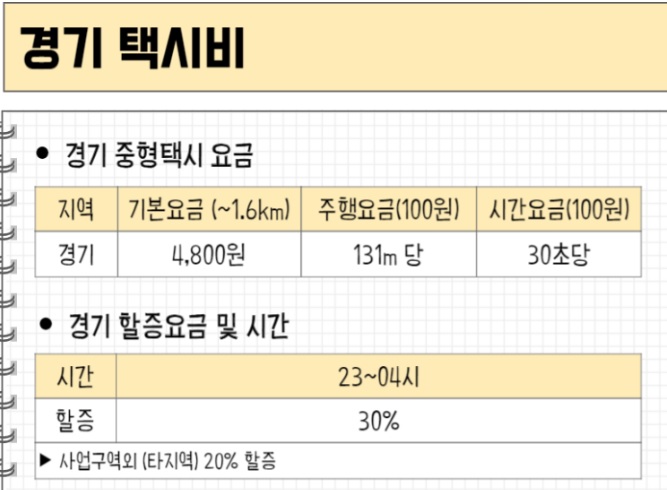 ● 야간할증료: 23:00~24:00(20%), 23:00~02:00(30%), 02:00~04:00(20%)