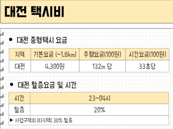 대전은 1.8km까지 기본요금 4,300원을 적용하고 있습니다. 기존 3,300원에서 1,000원 인상된 것으로 타 지역과 마찬가지로 주행요금과 시간요금이 모두 인상됐습니다.
