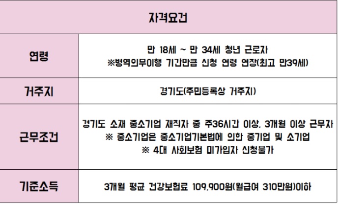 - 근무조건 : 경기도 소재 중소기업 재직자 중 주 36시간 이상, 3개월 이상 근무자