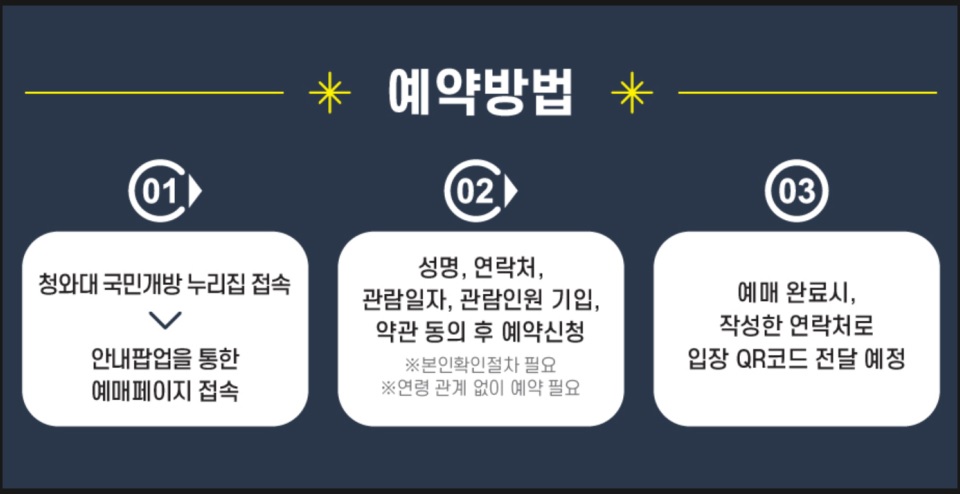 입장권 예매는 청와대 국민개방 누리집에서 무료로 예매하실 수 있습니다. 예매 시 본인명의 번호인증을 통해 1인 최대 6 매까지 예매 가능하며 행사당일 오후 6시까지 취소가 가능합니다. 현장예매는 별도로 진행하지 않습니다.