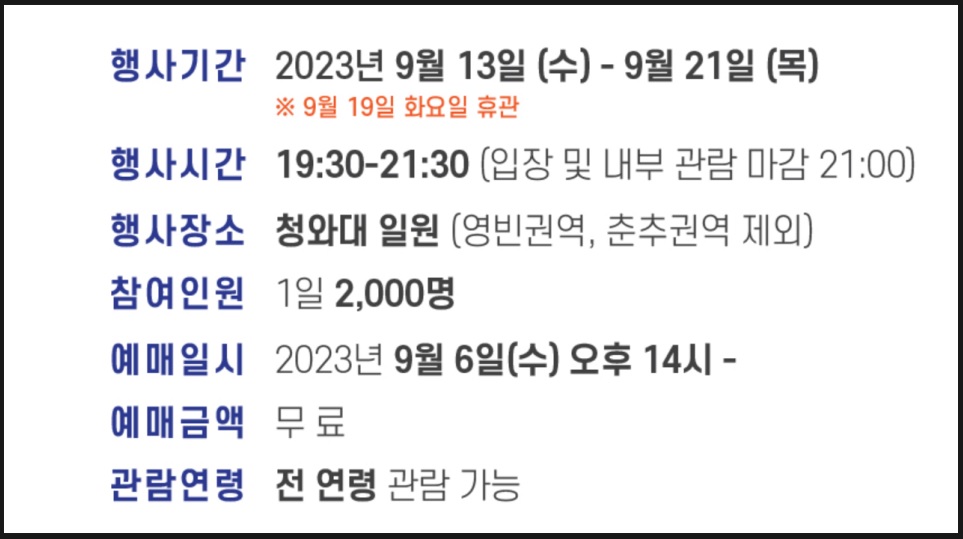 2023년 청와대 밤의 산책 하반기 행사는 9월 13일 수요일부터 21일 목요일까지 개최합니다. 행사 기간 동안 매일 오후 7시 30분부터 9시 30분까지 1일 최대 관람 인원 2,000 명을 대상으로 청와대 야간관람을 운영합니다.(입장마감 오후 9시)