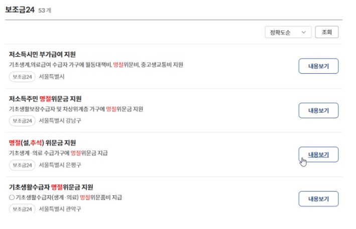그러면 위 화면처럼 현재 해당 지역의 명절지원금 현황이 보입니다. 그중에서 내가 거주하는 지자체의 지원금이 있을 경우 [내용 보기]를 클릭하셔서 상세한 내용을 확인해 주시면 되겠습니다.