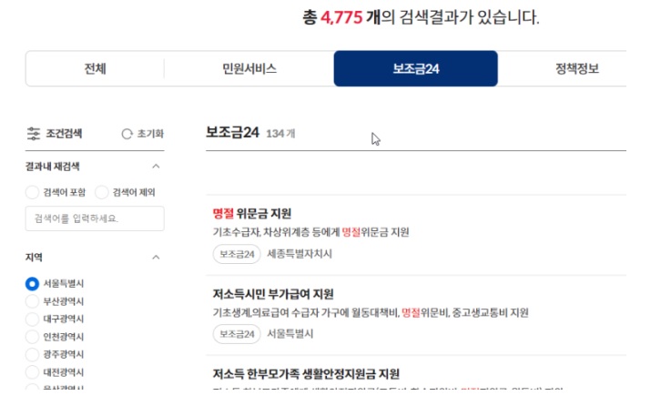그러면 위 화면처럼 무수히 많은 검색결과가 나타납니다. 여기서 상단 메뉴 중 [보조금 24]를 선택해 주시고 화면 왼쪽에 지역선택에서 현재 거주하고 계신 시/도를 선택해 주신 뒤 아래쪽의 조건 검색하기 버튼을 클릭해 줍니다.