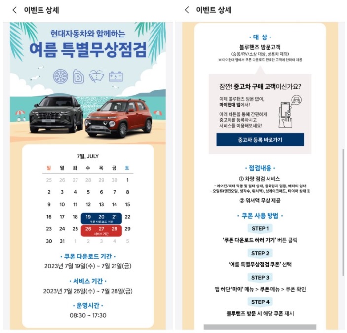 무상점검 쿠폰은 19일(수)부터 21일(금)까지 △현대차 '마이현대', △제네시스 'MY GENESIS', △기아차 '마이기아' 등 각사 통합고객서비스 애플리케이션에서 선착순으로 발급됩니다.