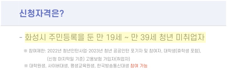 ※ 참여제한 : 2022년 청년인턴사업, 2023년 청년 공공인턴 포리자 및 참여자, 대학교 재학생(휴학생 포함), (신청 마지막 날 기준) 고용보험 가입자(취업자)