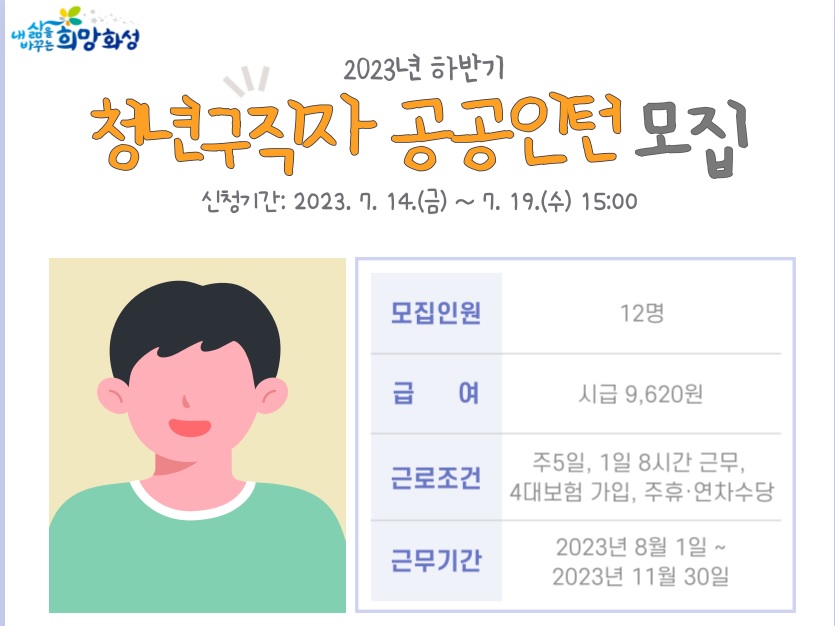 오늘 화성시 공공기관 청년인턴 모집 소식 전해드렸습니다. 기간 내 신청하셔서 좋은 결과가 있으면 좋겠습니다. 흐린 하늘과 무더위가 이어지는 장마철 건강관리 조심하시고, 항상 좋은 하루 보내시길 바랍니다. 감사합니다.