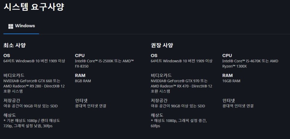 위를 보시면 시스템 요구 사항을 확인할 수 있습니다. 요구 사항이기 때문에 실제 플레이를 위해서는 더 높은 성능이 필요할 수 있습니다. 따라서 최소 사양보다는 최소 권장 사양을 충족하는 것이 좋을 것입니다. 물론 더 많은 성능을 추천합니다 권장 사양은 Windows 10 버전 1909 빌드 이상, 비디오 카드는 GTX 970 또는 RX 470 Direct12 호환 시스템 이상, 스토리지 용량은 90GB SSD 이상, 1080p 그래픽 해상도는 60 fps를 기준으로 합니다. CPU에는 i5-4670K 또는 Ryzen 1300X, 16GB RAM, 광대역 인터넷 연결 등이 필요합니다. 사실 높은 사양을 요구하는 것은 아니지만, 권장 사양 역시 중간 규격이므로 실제 사양을 높이는 것이 좋습니다.