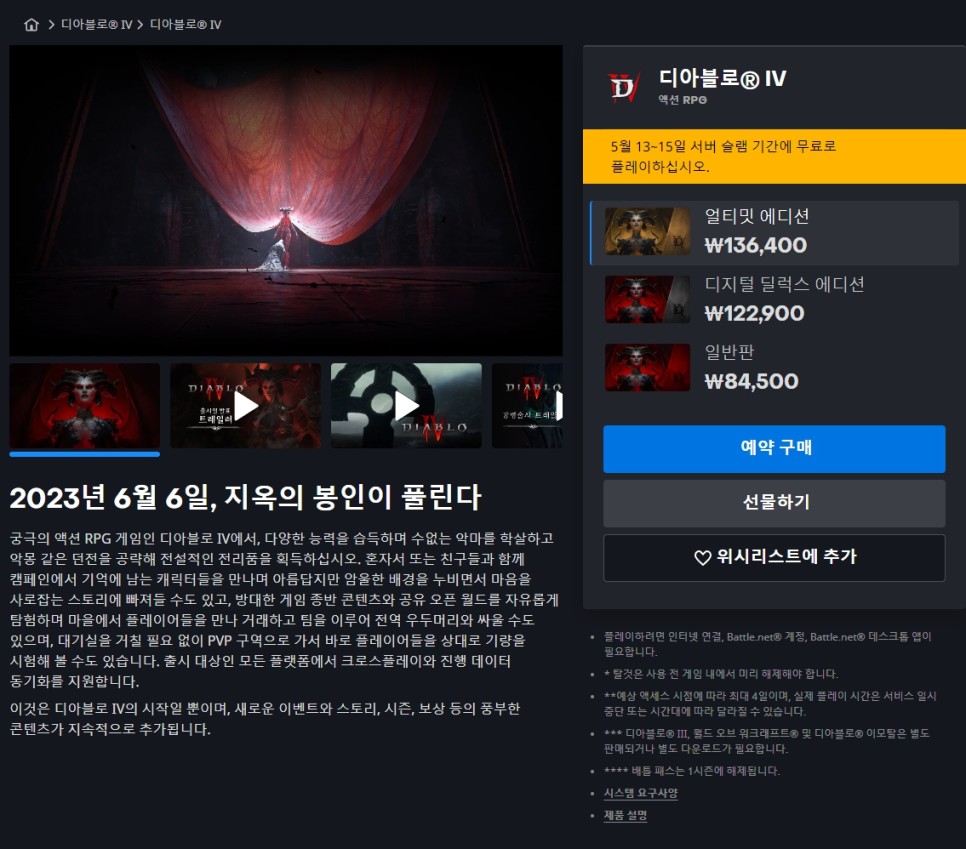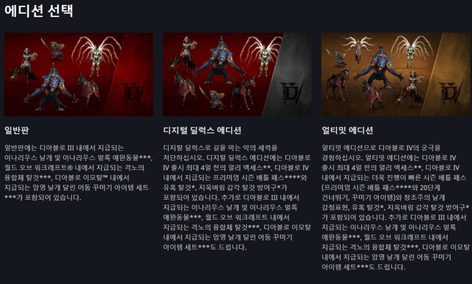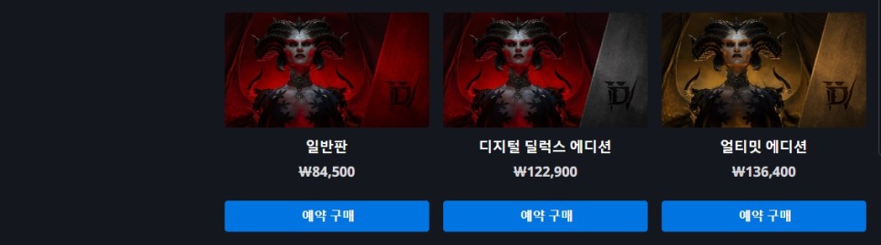여기서 예약구매 84,500원을 누르시면 됩니다. 참고로 디아블로 4는 얼티밋 에디션, 디지털 딜럭스 에디션, 일반판으로 구성되어 있습니다. 무엇이 다른지 아래에서 알아보겠습니다.