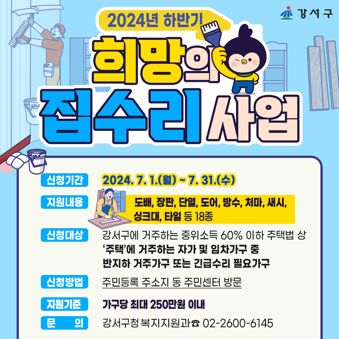 강서구에서 하반기 희망의 집수리 사업 신청을 받습니다. 도배, 장판, 단열, 보일러, 방역, 위생기구, 천장보수 등 18개 공종을 지원합니다. 개인사비로 하면 비용이 많이 드는데 가구당 최대 250만 원을 지원합니다. 예산소진 시 종료되니 서둘러 신청하시기 바랍니다. 아래에서 지원자격 및 신청방법을 알아보겠습니다.