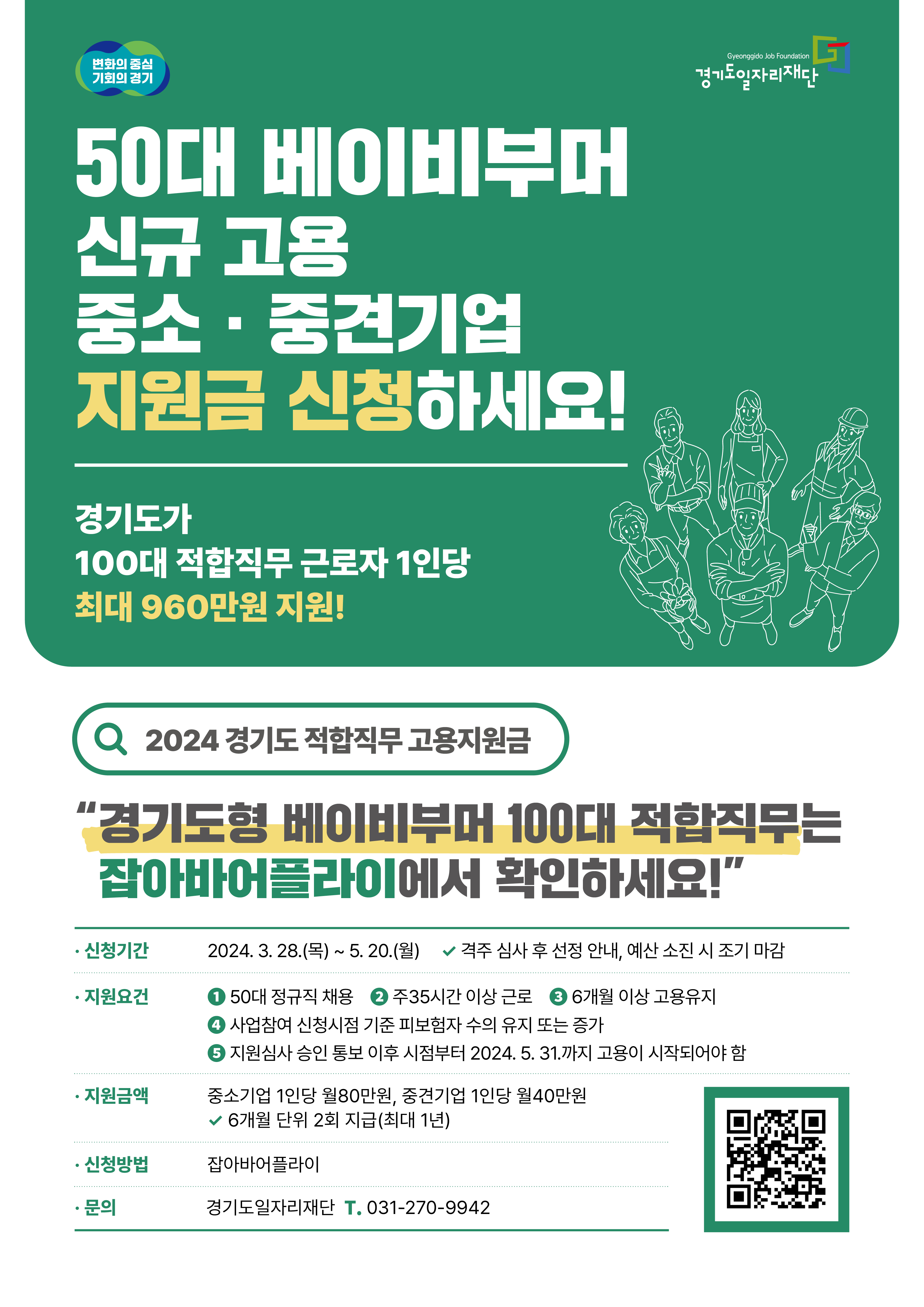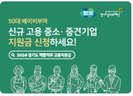 경기도에서 경기도에 주민등록을 둔 만 50세 이상 만 59세 이하 미취업 베이비부머를 경기도형 적합직무로 정규직 신규 채용한 도내 중소 ․ 중견기업에게 근로자 1인당 최대 960만 원 지원합니다. 예산소진 시 조기종료되니 서둘러 신청하시기 바랍니다. 아래에서 지원자격 및 신청방법을 알아보겠습니다.