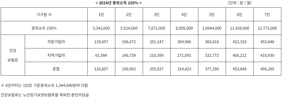- (산정방법) 최근 3개월 평균 건강보험료 고지금액이 가구원 수에 따른 기준중위소득의 건강보험료 이하여야 함