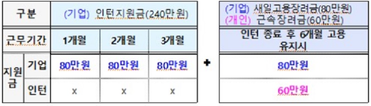 - 참여기업에는 인턴 1인당 3개월간 80만 원씩 총 240만 원 인건비 지원 및 정규직 전환 후 6개월 이상 고용 유지 시 80만 원 추가 지원