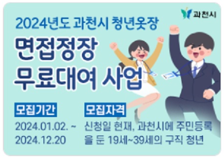 과천시에서는 면접을 보는 청년들에게 무료로 정장을 대여해 줍니다. 청년들의 취업사기를 높이기 위해 지원하는 사업입니다. 개인사비로 하면 비용이 많이 드는데 무료입니다. 예산소진 시 종료되니 서둘러 신청하시기 바랍니다. 아래에서 지원자격 및 신청방법을 알아보겠습니다.
