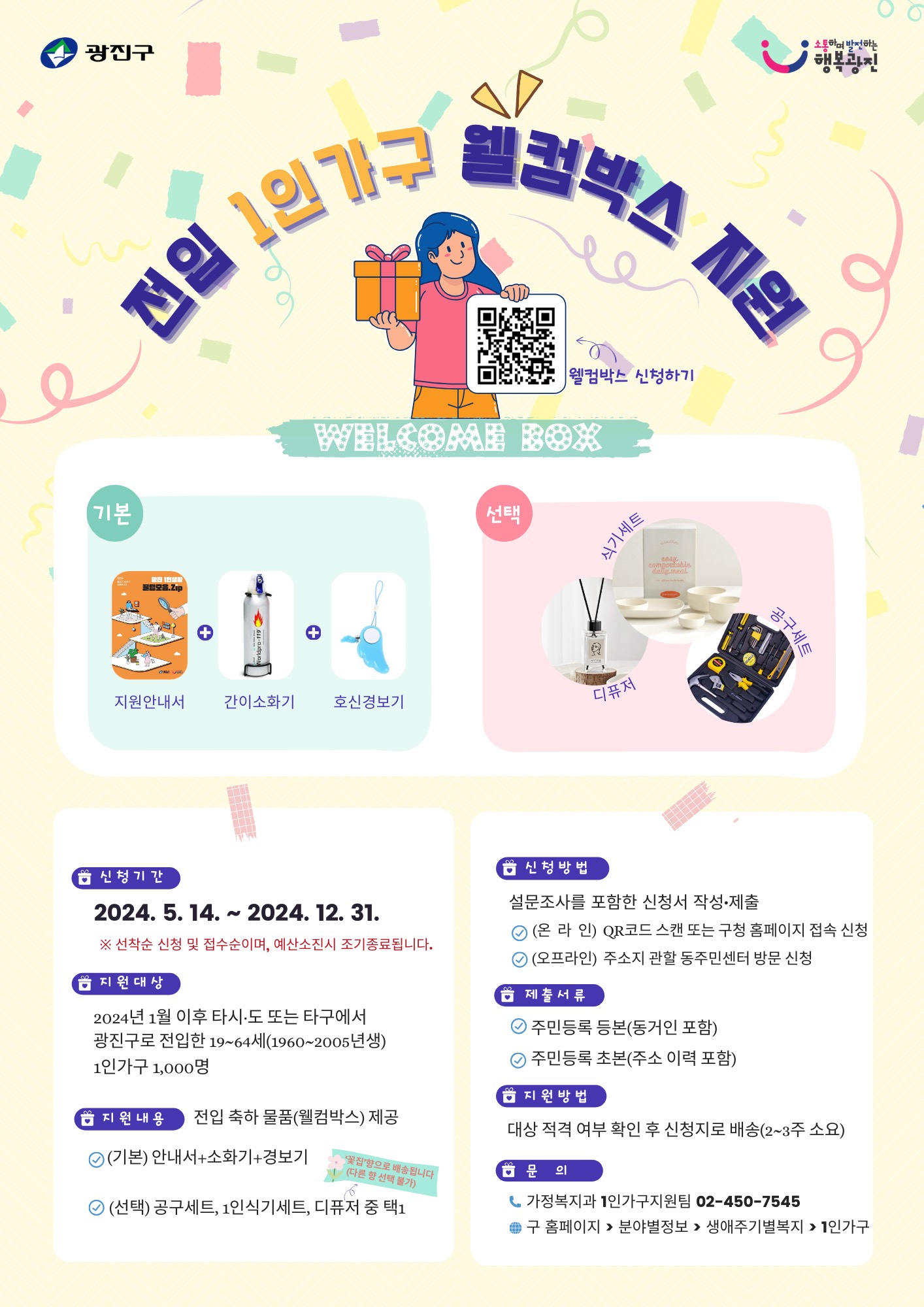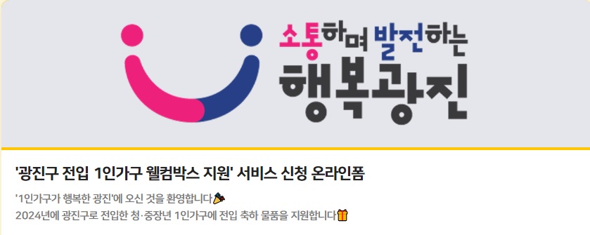 광진구에서 2024년 1월 이후 타시, 도 또는 타구에서 전입한 1인가구에게 전입축하물품을 지원합니다. 이사하느라 힘들었는데 축하선물을 주니 너무 좋은 거 같습니다. 예산소진 시 종료되니 놓치지 마시고 서둘러 신청하시기 바랍니다. 아래에서 지원자격 및 신청방법을 알아보겠습니다.