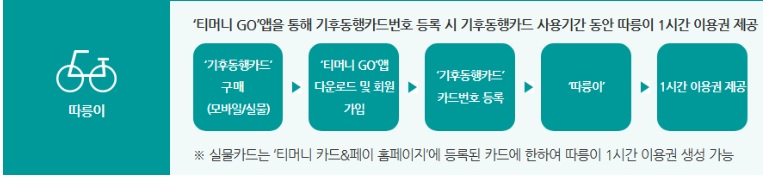 따릉이 이용이 포함된 6만 5천 원권을 구입한 경우에는 휴대전화 기종에 관계없이 ‘티머니 GO’ 앱에서 기후동행카드의 번호 16자리를 입력 후 1시간 이용권을 30일간 무제한 사용할 수 있습니다. 단, 실물카드 이용자는 카드 뒷면 좌측 상단의 큐알코드로 접속해 ‘기후동행카드’ 회원가입을 미리 해야 합니다.