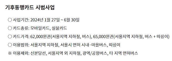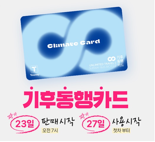1회 요금 충전으로 30일간 대중교통(지하철, 버스), 따릉이를 무제한 이용할 수 있는 대중교통 통합 정기권입니다. 기존 교통 정기권은 횟수가 제한되는 등 이용에 제한이 있었지만, 기후동행카드는 저렴한 가격에 무제한 이용할 수 있어, 편의성을 높였다는 특징이 있습니다. 1월 23일 오전 7시부터 카드판매가 시작되고, 1월 27일 첫차부터 사용 가능합니다.