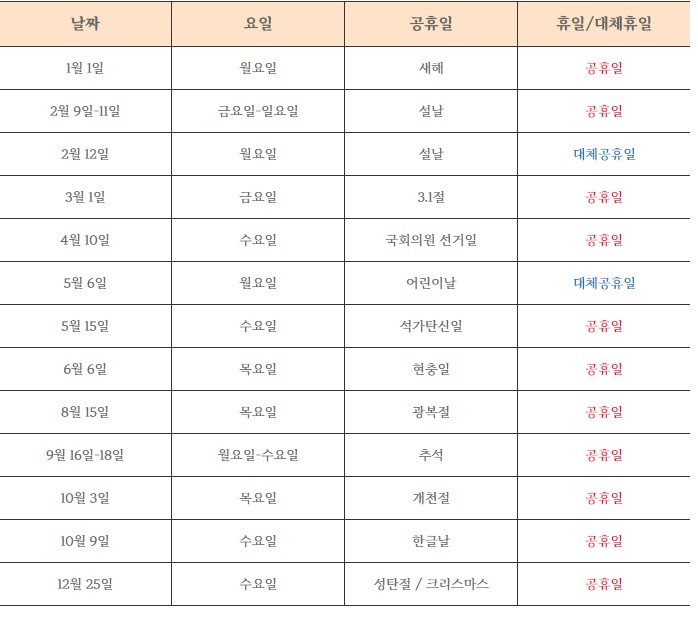 2월에는 설날이 2월 10일인 토요일에 위치해 12일이 대체공휴일로 지정되어 2월 9일(금)부터 2월 12일(월)까지 4일의 연휴가 생기게 됩니다.
