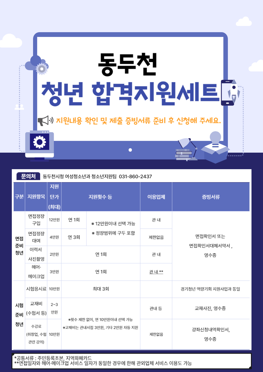 동두천시에서 면접준비청년들에게 면정정장 구입 및 대여, 이력서 사진촬영, 헤어메이크업비를 지원합니다. 또 시험준비청년들에게는 시험응시료, 교재비, 수강료를 지원합니다. 개인사비로 하면 비용이 많이 드는데 너무 좋은 거 같습니다. 예산소진 시 종료되니 서둘러 신청하시기 바랍니다. 아래에서 지원자격 및 신청방법을 알아보겠습니다.