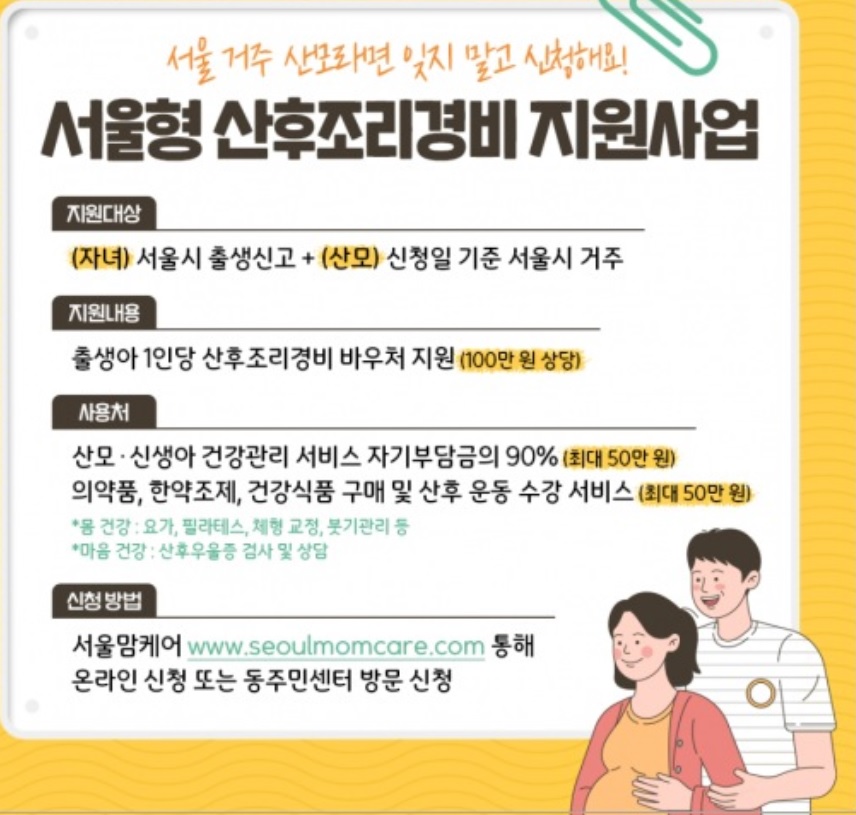 서울시에서 출산에 드는 비용과 산모의 건강회복을 위한 산후조리 경비를 지원합니다. 출생아 1인당 100만 원을 지원합니다. 출산일로부터 60일 이내에 신청해야 하니 서두르시기 바랍니다. 아래에서 지원자격 및 신청방법을 알아보겠습니다.