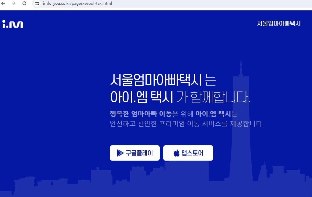 : 운영사 앱, 아이. 엠(i.M) 설치 → 아이. 엠(i.M) 회원 가입 → 서울엄마아빠택시 메뉴 → 자치구 자격 결정 → 승인 완료 시 서비스 이용(계정 내 포인트로 결제)