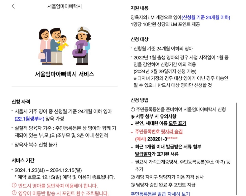 서울시에서 24개월 이하 영아 양육가정이 편하하게 외출할 수 있도록 서울엄마아빠택시를 운영합니다. 작년에는 서울시 총 16개 구에서만 실시했지만 24년 올해는 서울 전체구로 확대되었습니다. 작년에 신청 못하신 분은 올해 신청하셔서 지원금 10만 원 받으시길 바랍니다. 예산소진 시 종료되니 서둘러 신청하시기 바라며 아래에서 지원자격 및 신청방법을 알아보겠습니다.