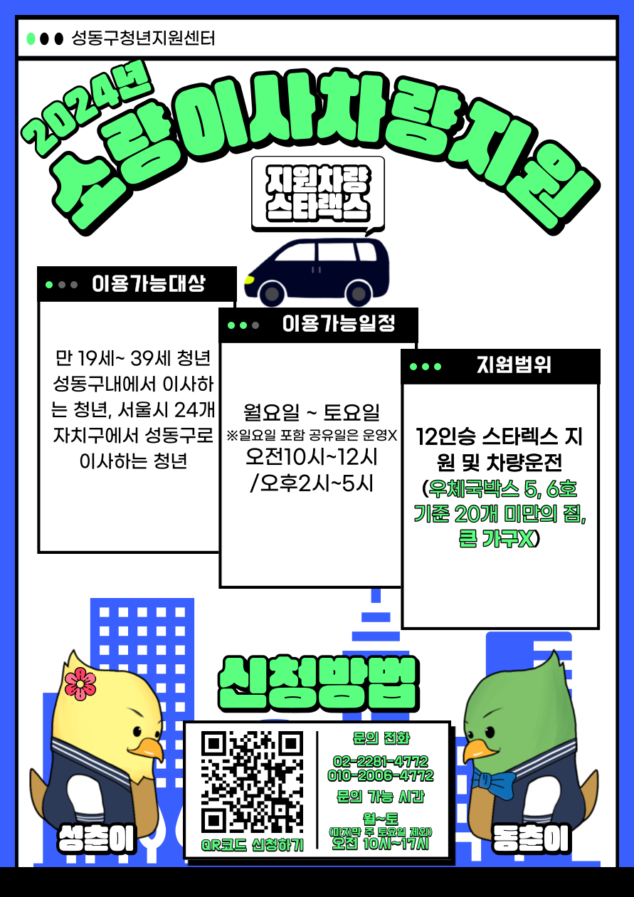 ※ 성동구청년지원센터 직원이 이사 출발, 도착 지점으로 차량을 운전해 주는 것을 지원해 드립니다.