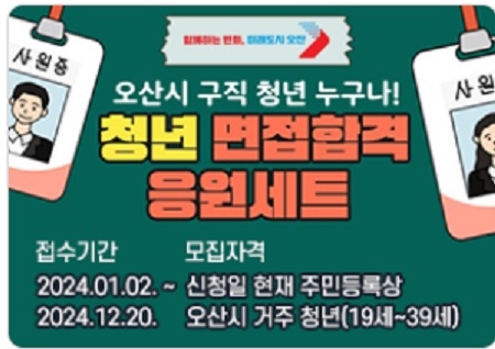 오산시에서 취업을 준비하는 청년 누구나 ① 면접정장 무료 대여 ② 이력서 사진촬영 ③ 헤어 메이크업 ④ 교재비를 지원하는 사업을 진행합니다. 청년들의 구직비용 부담을 낮추고, 구직활동을 촉진하여 취업 성공을 지원합니다. 개인 사비로 하면 비용이 많이 드는데 전부 무료입니다. 예산소진 시 종료되니 서둘러 신청하시기 바랍니다. 아래에서 지원자격 및 신청방법을 알아보겠습니다.