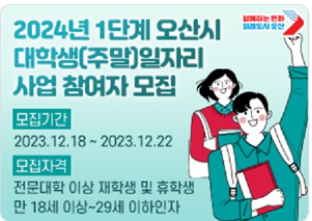 오산시에서 겨울방학을 한 대학생들에게 주말을 이용하여 시정을 체험하며 진로 및 적성을 탐색하고, 근무경험을 쌓을 수 있는 기회를 제공합니다. 급여도 맞으면서 일을 배우니 좋은 거 같습니다. 접수기간이 짧으니 서둘러 신청하시기 바랍니다. 아래에서 지원자격 및 신청방법을 알아보겠습니다.