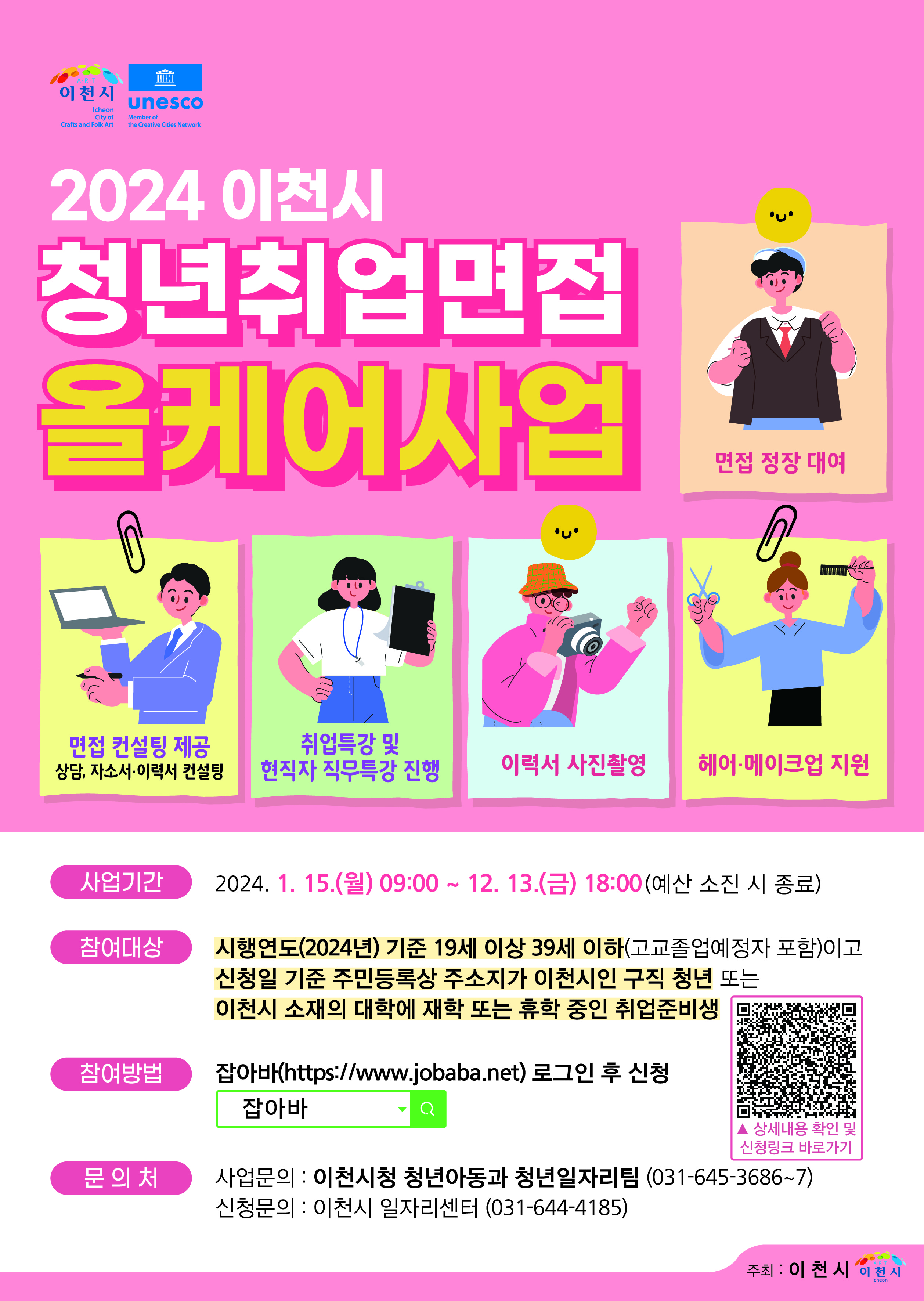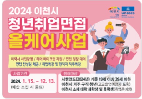 이천시에서 청년 구직자들을 대상으로 청년취업면접 올케어 사업을 진행합니다. 면접 정장 대여뿐만 아니라 면접 컨설팅, 취업특강, 이력서 사진 촬영, 헤어·메이크업까지 지원하고 불합격 시에 다른 일자리 취업 알선 및 정보 제공하는 면접 사후관리까지 지원하는 합니다. 예산 소진 시 종료되니 서둘러 신청하시기 바랍니다. 아래에서 지원자격 및 신청방법을 알아보겠습니다.