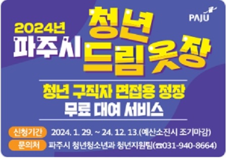 파주시에서 구직을 앞둔 청년들에게 면접용 정장 무료대여 서비스를 실시합니다. 경제적 부담을 줄이고 구직활동을 촉진하여 취업성공을 지원합니다. 사비로 정장을 구매하면 비용이 많이 드는데 무료이니 너무 좋은 거 같습니다. 예산소진 시 종료되니 서둘러 신청하시기 바랍니다. 아래에서 지원자격 및 신청방법을 알아보겠습니다.