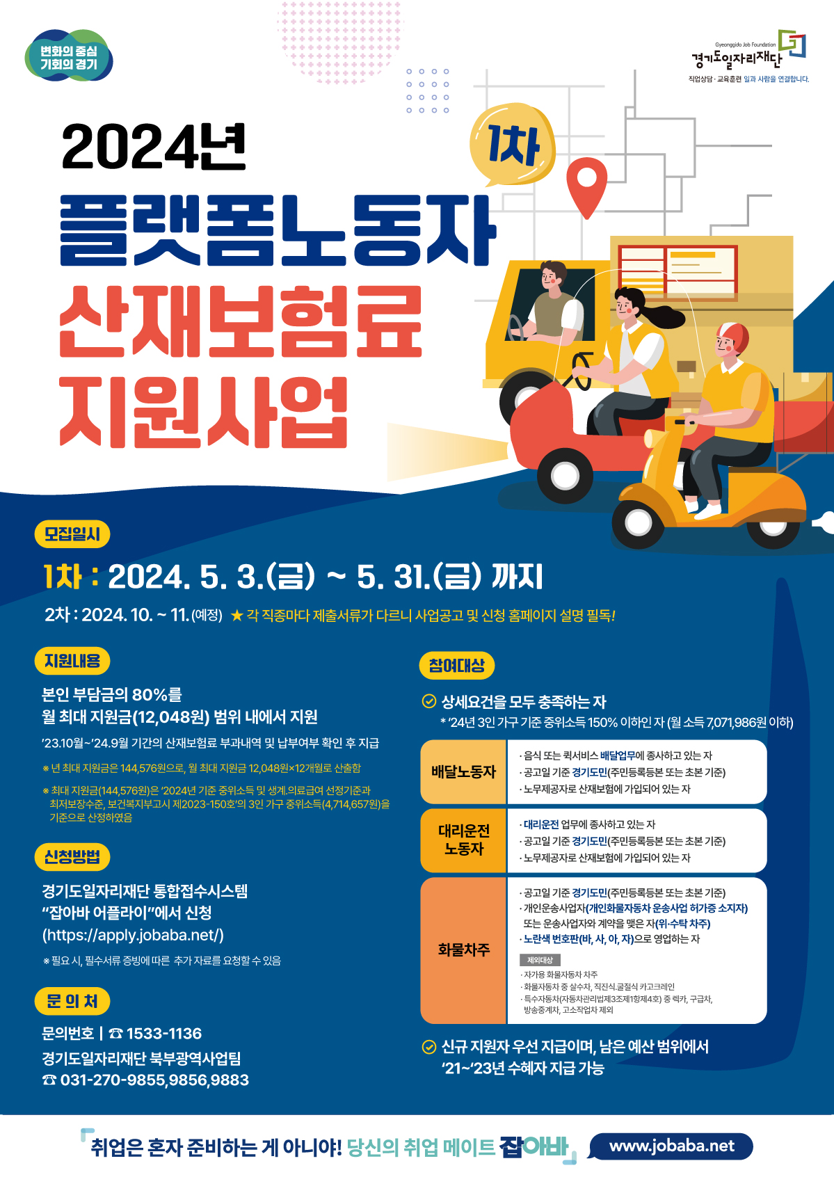 경기도일자리재단에서 플랫폼노동자의 안전한 근로환경 확대를 위하여 「2024년 플랫폼노동자 산재보험료 지원사업」 참여자를 모집합니다. 본인 부담금의 80%를 년 2회 지원합니다. 예산소진 시 종료되니 서둘러 신청하시기 바랍니다. 아래에서 지원자격 및 신청방법을 알아보겠습니다.