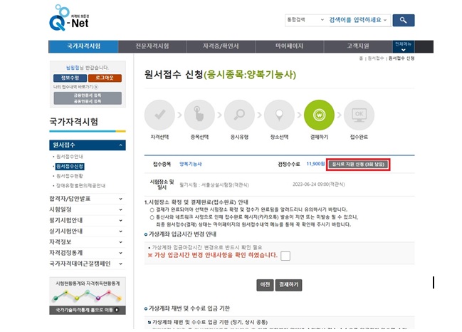 ※ 원서접수 시 응시료 지원받을 시험 선택 후 결제