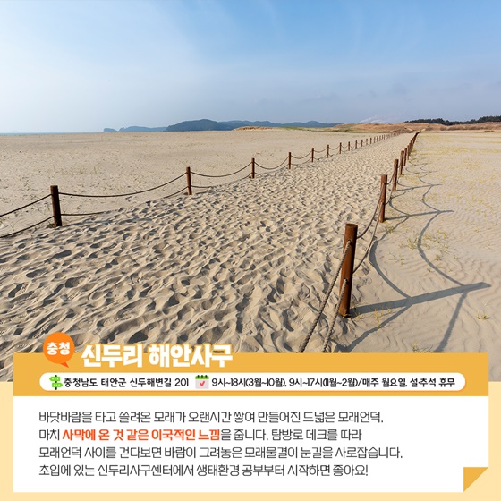 바닷바람을 타고 쓸려온 모래가 오랜 시간 쌓여 만들어진 드넓은 모래언덕, 마치 사막에 온 것 같은 이국적인 느낌을 줍니다. 탐방로 데크를 따라 모래언덕 사이를 걷다 보면 바람이 그려놓은 모래 물결이 눈길을 사로잡습니다. 초입에 있는 신두리사구센터에서 생태환경 공부부터 시작하면 좋습니다.