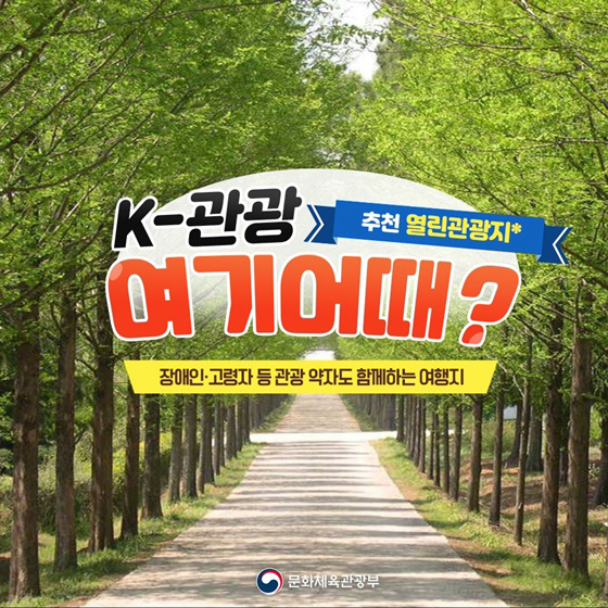 온 가족이 함께 나들이 가기 딱 좋은 계절 4월입니다. 휠체어도, 유아차도 여행하는 데 어려움 없는 무장애 여행지인 '열린 관광지' 베스트 5곳을 소개합니다. 자연을 즐기면서 편안한 여행을 즐길 수 있습니다.
