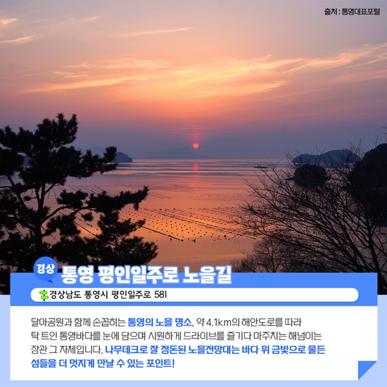 달아공원과 함께 손꼽히는 통영의 노을 명소, 약 4.1km의 해안 도로를 따라 탁 트인 통영바다를 눈에 담으며 시원하게 드라이브를 즐기다 마주치는 해넘이는 장관 그 자체입니다. 나무데크로 잘 정돈된 노을 전망대는 바다 위 금빛으로 물든 섬들을 더 멋지게 만날 수 있는 포인트입니다.