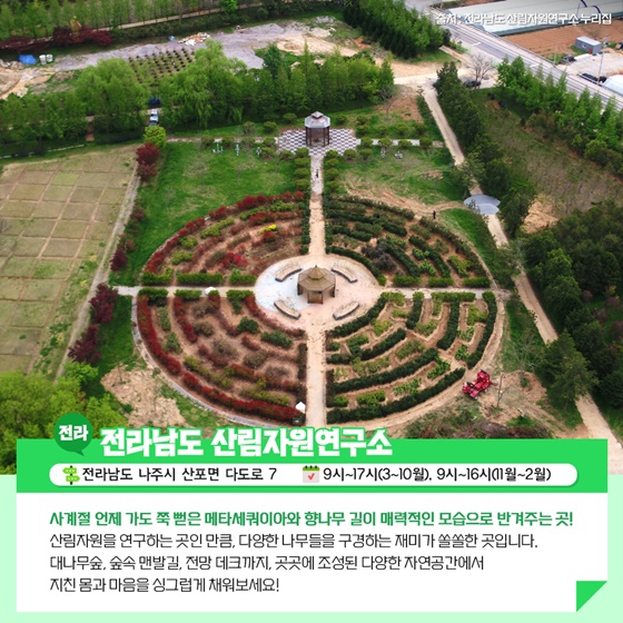 사계절 언제 가도 쭉 뻗은 메타세쿼이아와 향나무 길이 매력적인 모습으로 반겨주는 곳입니다. 산림자원을 연구하는 곳인 만큼, 다양한 나무들을 구경하는 재미가 쏠쏠한 곳입니다. 대나무숲, 숲 속 맨 발길, 전망데크까지, 곳곳에 조성된 다양한 자연 공간에서 지친 몸과 마음을 싱그럽게 채워보세요.